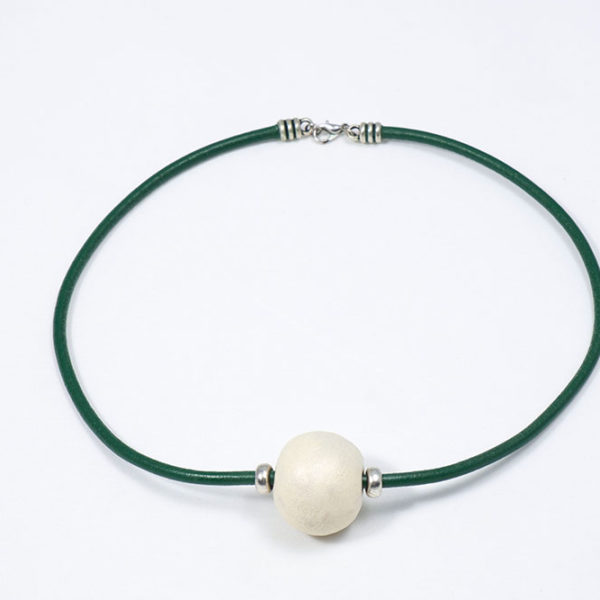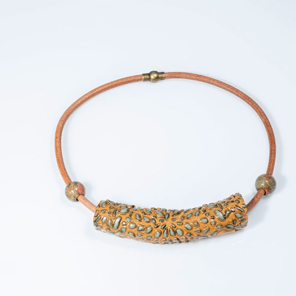 Pieza de cerámica modelada a mano, con doble cocción y esmaltada en color cobre metalizado y verde mate.